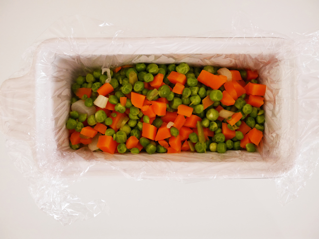 - Placer les légumes cuits à la vapeur dans le moule en terrine,